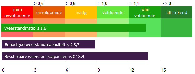 Om te bepalen of het weerstandsvermogen toereikend is, leggen we een relatie tussen de financieel beoordeelde risico's (dit is het benodigde weerstandscapaciteit) en de beschikbare weerstandscapaciteit. Dit geeft het weerstandsvermogen weer. De verhouding tussen beide is het weerstandsratio. Ons weerstandsratio beoordelen we met 1,6 als ruim voldoende. Door het inzicht in de risico’s actueel te houden, blijft het weerstandsratio schommelen, maar blijven de fluctuaties beperkt.